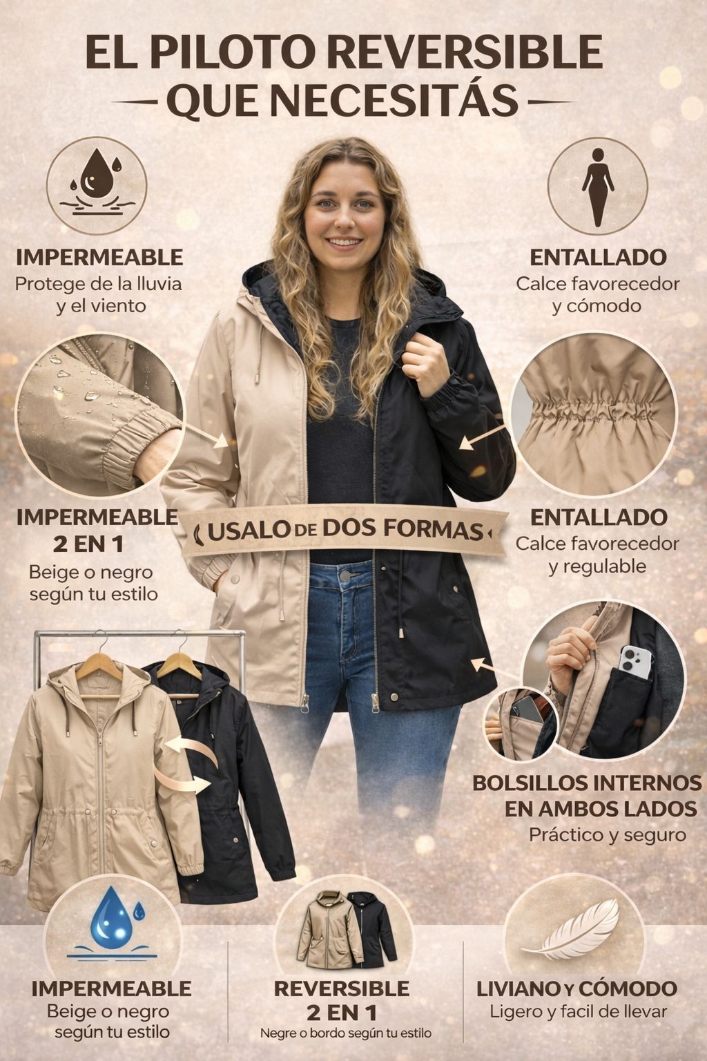 Incorporá a tu guardarropas este piloto reversible impermeable, un básico imprescindible para la media estación. Gracias a su diseño 2 en 1, podés elegir entre dos colores según tu estilo o necesidad del día: negro o beige.