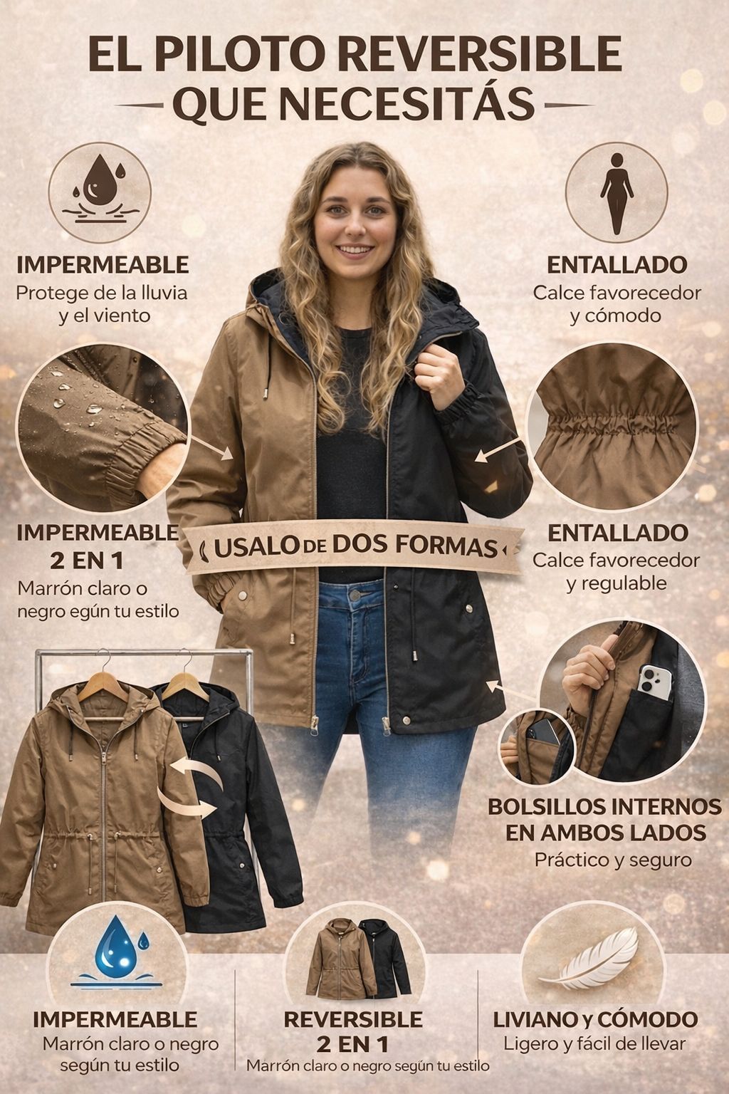 Incorporá a tu guardarropas este piloto reversible impermeable, un básico imprescindible para la media estación. Gracias a su diseño 2 en 1, podés elegir entre dos colores según tu estilo o necesidad del día: negro o camel.