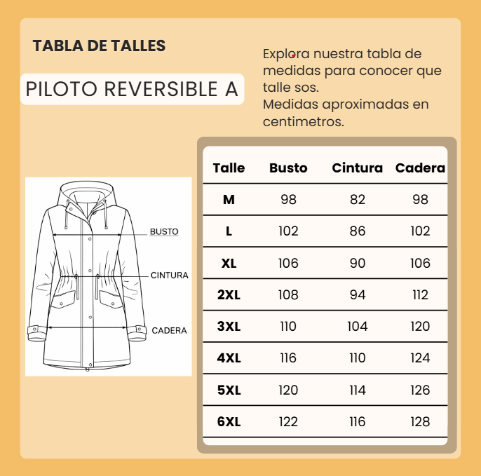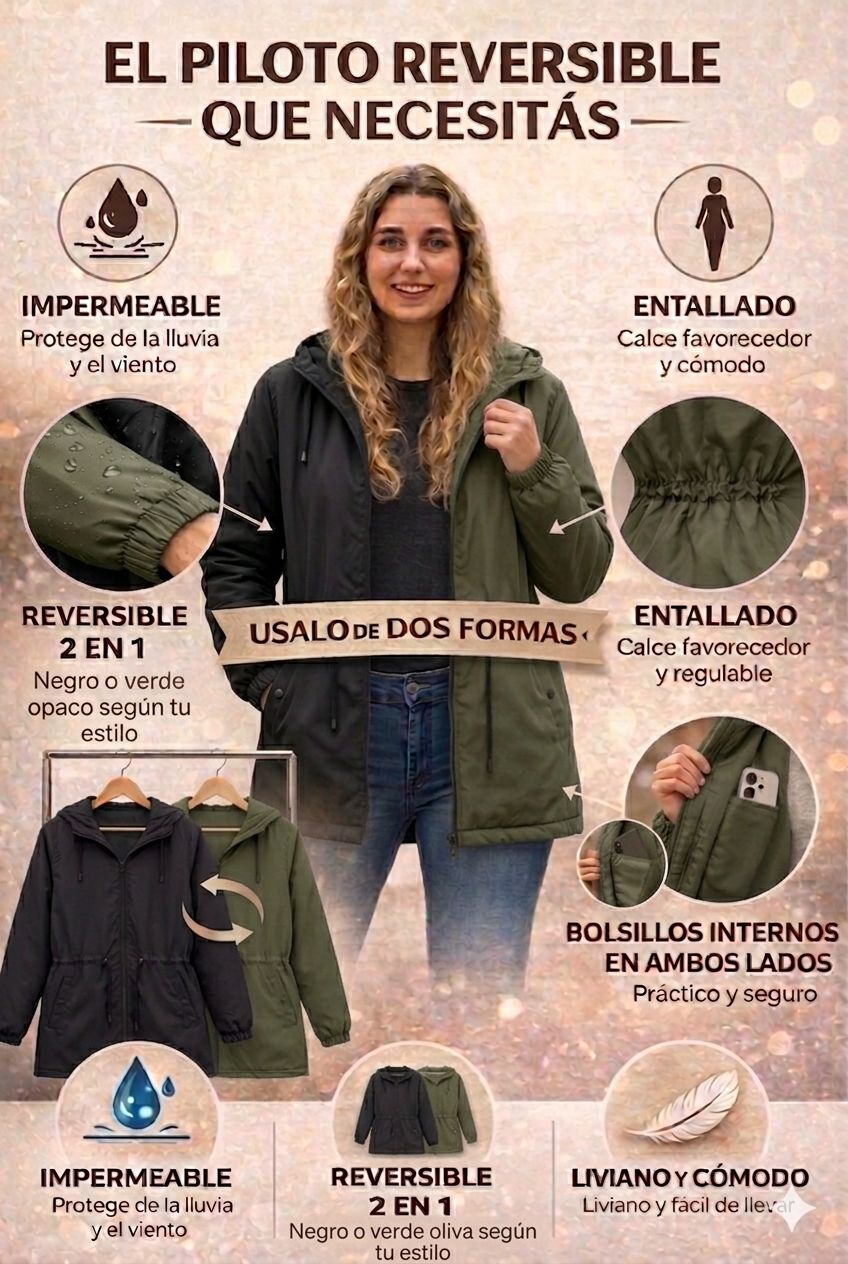 Este piloto destaca por su calidad premium importada, que garantiza resistencia al agua y comodidad. La capucha desmontable te permite adaptarte a distintos climas y estilos, mientras que los bolsillos en ambos lados ofrecen practicidad para llevar tus objetos personales con seguridad.